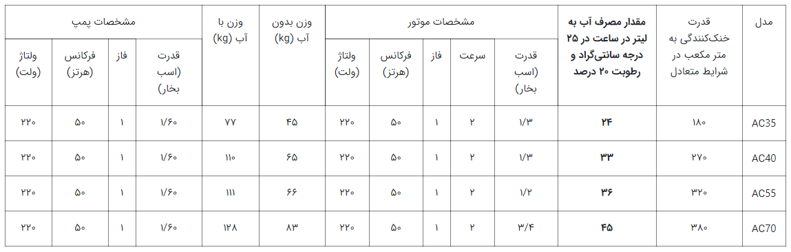 با توجه به جدول بالا، مشخص است که مثلاً برای یک کولر AC40 با ظرفیت ۳۵۰۰ در شرایط عادی، یعنی ۲۵ درجه سانتیگراد و رطوبت ۲۰ درصد، مصرف آب در هر ساعت برابر با ۳۳ لیتر در ساعت خواهد بود.