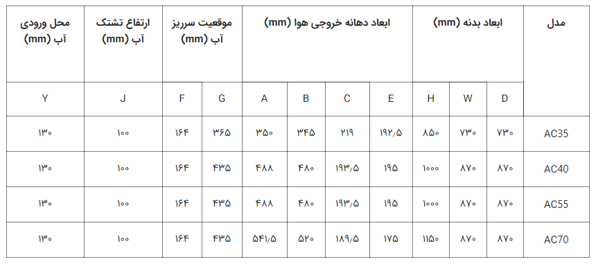 کولرها در قالب مدلهایی بیان میشوند که چهار مورد از اندازههای استاندارد آنها AC70 ،AC55 ،AC40 ،AC35 هستند. شکل زیر را برای یک کولر معمولی در نظر بگیرید.