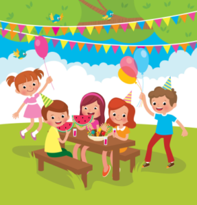 تصویر گرافیکی جشن تولد یک دختر با کیک و شمع و بادکنک و خندیدن دوستان دور میز