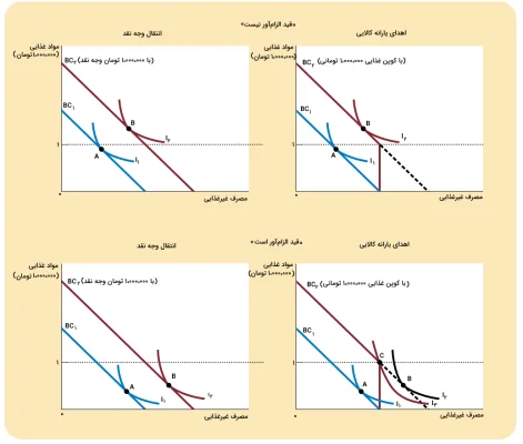 واریز وجه نقدی این اختیار را برای او فراهم میکند که که مبلغ دریافتی خود را مطابق روش دلخواه خود خرج کند. در نتیجه، مصرف او به نقطه میرسد. از طرفی دیگر، دریافت یارانه کالایی یا همان کوپن غذایی این الزام را برای او بوجود میآورد که حداقل ۱،۰۰۰،۰۰۰ تومان را برای مواد غذایی خرج کند.