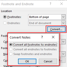 در پنجره جدید، گزینه «Convert» را بزنید. توجه داشته باشید که ورد به طور خودکار متوجه میشود که سند شما دارای پانویس است یا پینوشت و تیک گزینه مناسب را میزند.