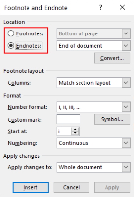 برای تغییر دادن محل پینوشت نیز کافی است ابتدا گزینه Endnote را تیک بزنید و سپس گزینه مورد نظر را از منوی روبهروی آن برگزینید. در نهایت پس از اتمام کار، گزینه «Apply» را بزنید تا تغییرات صورت گرفته، ذخیره شوند.