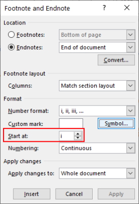 برای شروع پینوشت یا پانویس در ورد از یک نقطه خاص، گزینه مد نظر خود را از کادر «Start at» انتخاب کنید.