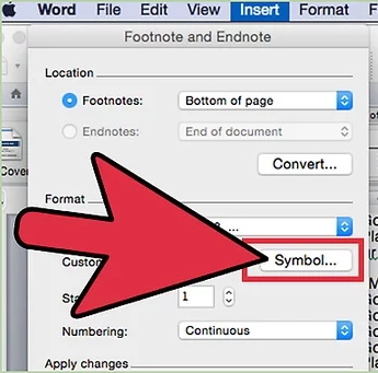 همچنین میتوانید از علامتی خاص برای نمایش پاورقی خود استفاده کنید. برای انجام این کار، گزینه Symbol را در کنار «Custom mark» بزنید.