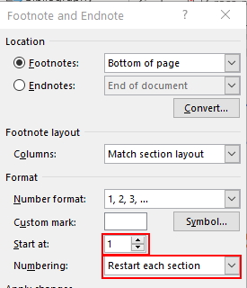 برای انجام این کار، وارد زبانه References شوید و روی فلش کوچک تعبیه شده در سمت راست و پایینی بخش Footnotes کلیک کنید. به این ترتیب، کادر Footnote and Endnote باز میشود. در این بخش منوی Start at را باز و گزینه 1 یا عدد مورد نظر را انتخاب کنید و گزینه Numbering را نیز روی حالت «Restart each Section» قرار دهید.