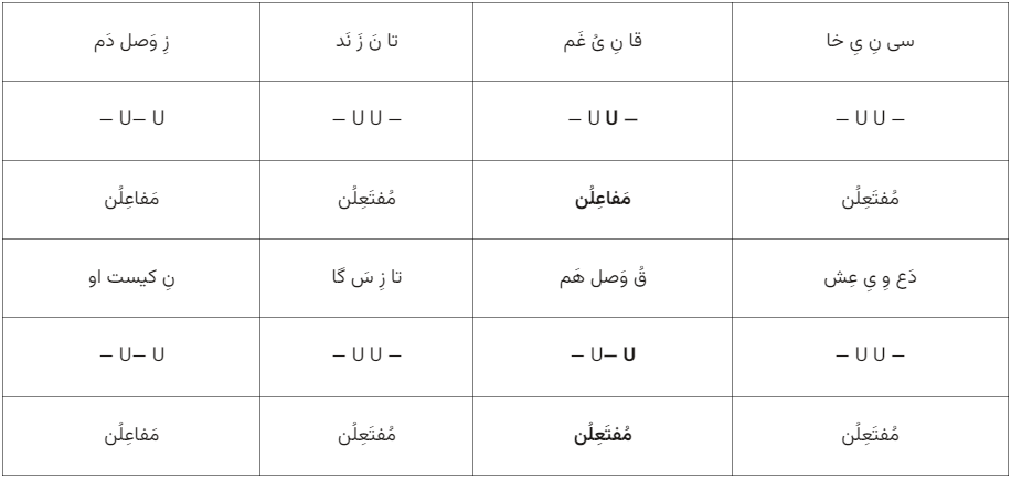 حرف عجیبی زدند: هجای بلند (—)، هجای کوتاه (U)، هجای بلند (—)، هجای بلند (—)، هجای بلند (—)، هجای کوتاه (U)، هجای بلند (—)
