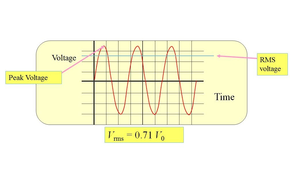 پس وقتی با جریان یا ولتاژ متناوب سروکار داریم، باید از مقادیر RMS آنها استفاده کنیم. یعنی یک جریان متناوب ۱۰ آمپری، همان مقدار حرارتی را تولید خواهد کرد که یک جریان مستقیم ۱۰ آمپری تولید میکند. در حالی که مقدار ماکزیمم جریان متاوب برابر با 14.14 آمپر است.