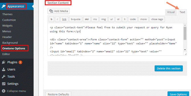 در مورد یک سایت وردپرس، معمولاً همه قالب ها، یک بخش فرم تماس دارند که میتوانید آن را سفارشی کنید. برای مثال در مورد قالب خاص تصویر زیر یک فیلد «Section Content» در صفحه اصلی وجود دارد که کد فرم تماس با ما در آنجا قرار گرفته است.