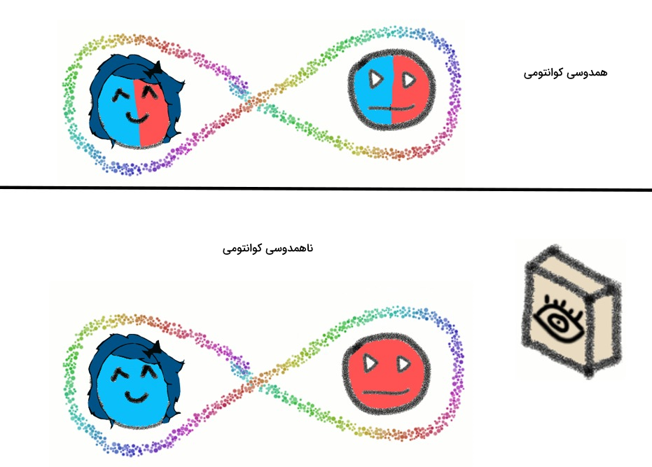 اما اگر به هر دلیلی سیستم کوانتومی به یک حالت غیرکوانتومی یا کلاسیکی تغییر حالت دهد، در این صورت ناهمدوسی داریم. برای مثال، در تصویر بالا مشاهده میکنید که در حالت ناهمدوسی حالتهای سیستم کاملا مجزا شدهاند در حالی که در همدوسی حالتها از هم جدا نبودند. بنابراین باید دقت کنیم که حالتهای باینری یا ، حالتهای کلاسیکی محسوب نمیشوند و کوانتومی هستند. قطعا ناهمدوسی برای یک کامپیوتر کوانتومی مطلوب نیست، چون با کلاسیکی شدن حالت سیستم امکانات قبل وجود ندارد. ناهمدوسی ممکن است در اثر نویزهای مختلفی مانند دما یا نوسان ایجاد شود. از طرفی، ناهمدوسی اجازه میدهد یک کامپیوتر کوانتومی بتواند با یک کامپیوتر کلاسیکی ارتباط برقرار کند.