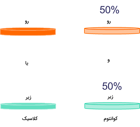 در این تصویر نتایج حاصل از پرتاب یک سکه از دید کوانتومی و کلاسیکی بررسی شده است و طبق آن، دید کلاسیکی با احتمال ۱۰۰٪ میگوید که یا سکه زیر است و یا رو. اما دید کوانتومی میگوید وضعیت نهایی سکه یک ترکیب خطی است از مجموع ۵۰٪ احتمال رو و ۵۰٪ احتمال زیر.