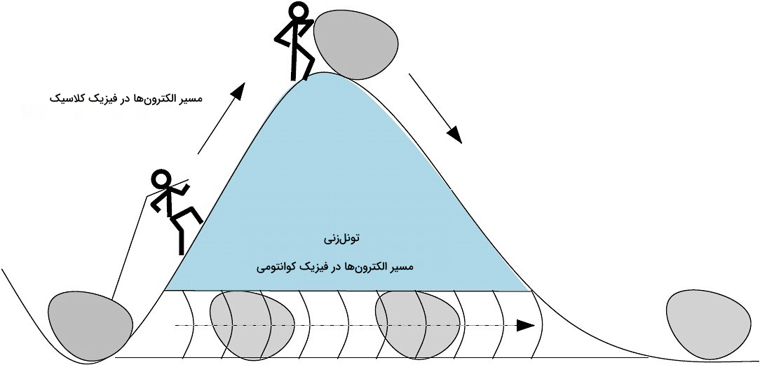 از طرفی با توجه به اینکه در ساختارهای زیر ۱۰ نانومتر، ابعاد ترانزیستورها به ابعاد اتمی نزدیک میشود و در این ابعاد، قوانین فیزیک کوانتومی نمود بیشتری پیدا میکنند، پس با کوچکتر شدن ترانزیستورها، فیزیک کوانتومی قواعد بازی را عوض میکنند. در این شرایط یک الکترون میتواند طبق شکل زیر از یک ترانزیستور به ترانزیستور دیگر تونلزنی انجام دهد، که این پدیده برای یک تراشه محاسباتی، امر مطلوبی نیست. اما این چالش باعث نشد تا بگوییم دنیای پردازندهها به انتهای خود نزدیک شده است. راهحل پیشنهادی این بود که محاسبات را از دنیای کلاسیک به دنیای کوانتوم بیاوریم.