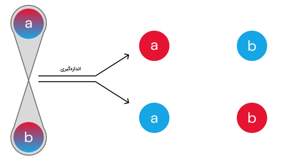 زمانی که دو سیستم کوانتومی در همتنیده میشوند، اگر یکی از این دو را بتوان مشاهده یا اندازهگیری کرد، حالت دیگری نیز کاملا با اولین سیستم همبسته است، صرفنظر از اینکه چقدر از آن فاصله داشته باشد. برای مثال فرض کنید یک سیستم کوانتومی مانند دو الکترون درهمتنیده دارید. اگر یکی از الکترونهای چنین سیستمی در حالتی با اسپین بالا مشاهده شود، الکترون درهمتنیده آن همواره در حالتی با اسپین پایین خواهد بود.