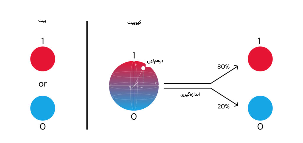 تصویر بالا تفاوت بیت معمولی و بیت کوانتومی را در حالت برهمنهی نشان میدهد. اگر به بیت معمولی دقت کنید، این نوع بیت با احتمال ۱۰۰٪ یا در حالت است یا در حالت . اما یک کیوبیت در حالت برهمنهی و پیش از اندازهگیری، میتواند همزمان هم و هم باشد (با احتمال مشخص برای هر کدام). برای نشان دادن حالت یک کیوبیت از یک تابع موج ریاضیاتی به نام (روش نامگذاری دیراک در کوانتوم) استفاده میشود. احتمالی را توصیف میکند که یک کیوبیت میتواند در یک حالت خاص قرار بگیرد. برای مثال احتمال اینکه کیوبیت در حالت برهمنهی باشد، برابر است با: