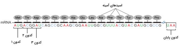 کدونها، مجموعههای سهتایی از نوکلئوتیدهای رشته mRNA هستند که هریک، اتصال اسید آمینه خاصی را در فرایند ترجمه، هدایت میکنند. به عنوان مثال، کدون AUG، رمزکننده اسید آمینه متیونین است و UUU فنیل آلانین را رمز میکند. اتصال صحیح تعداد مشخصی از اسیدهای آمینه، در نهایت، یک زنجیره پروتئینی را ایجاد میکند که در مراحل بعد، با ایجاد انواع پیوندهای شیمیایی، به صورت سه بعدی درمیآید و عملکرد خود را در سلول، آغاز میکند.