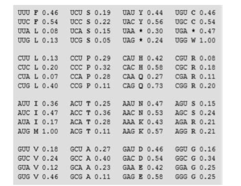 جالب است بدانید غلظت tRNAها در سلولهای مختلف نیز با هم متفاوت است. به این ترتیب، ممکن است tRNA خاصی در سلول انسان، پُریاب و در سلول ای. کولی، کمیاب باشد. پژوهشگران علم ژنتیک، از این ویژگی برای تنظیم بیان ژنهای بیگانه، در سلولهای میزبان استفاده میکنند. در هر موجود زنده، فراوانی نسبی کدونهای رمزکننده آمینو اسیدهای مختلف، در جدولی به نام «جدول ارجحیت کدونی» (Codon Usage Table) جمعآوری میشود که نمونهای از آن در ادامه آورده شده است.