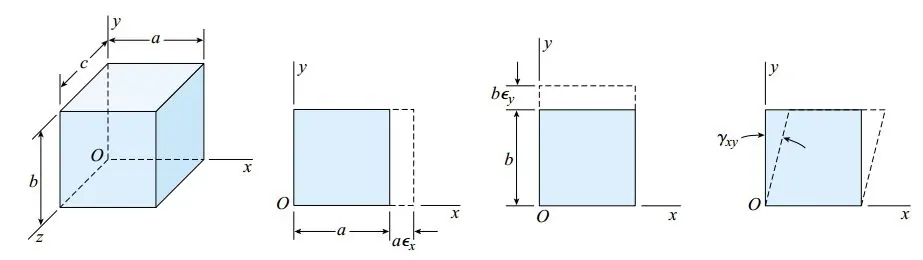 «کرنش صفحهای» (Plane Strain)، بر روی یک صفحه به وجود میآید. در این نوع کرنش، یکی از سه مولفه اصلی کرنش برابر با صفر میشود. به همین دلیل، تغییر ابعاد در فضای دوبعدی رخ میدهد. تصویر زیر، یک المان تحت کرنش صفحهای و مولفههای نرمال و برشی در آن را نمایش میدهد.
