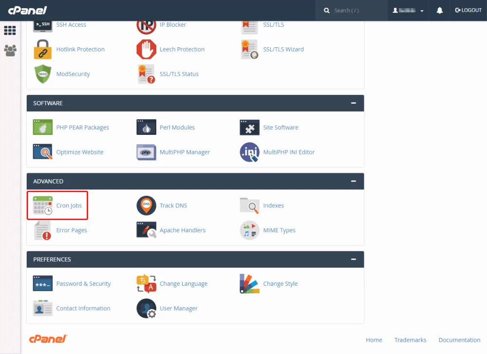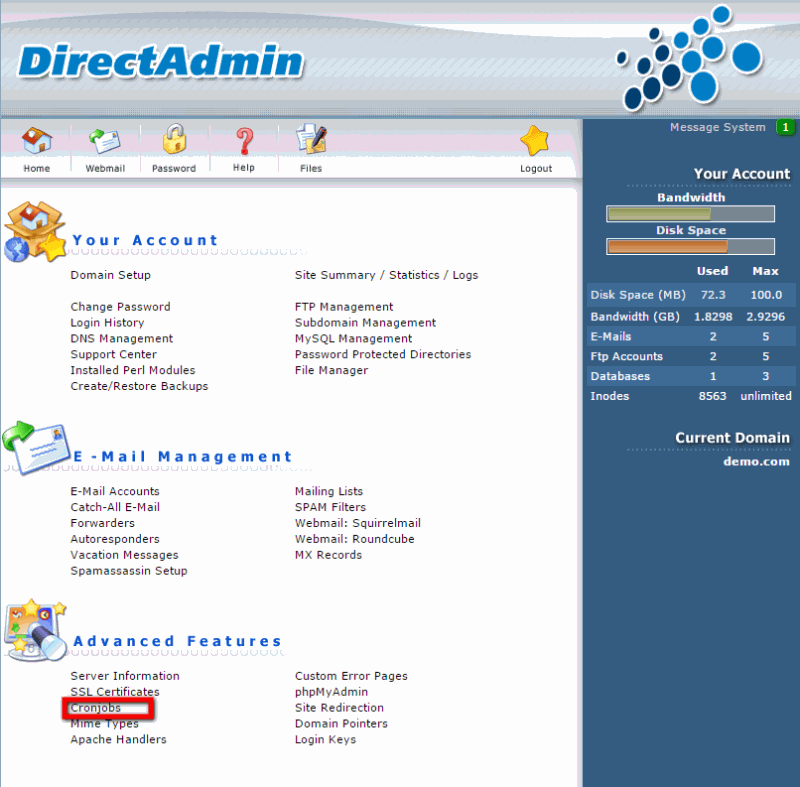 در ادامه این بخش نحوه ایجاد کرون جاب در دایرکت ادمین آورده شده است. به عنوان نخستین گام لازم است تا در صفحه آغازین دایرکت ادمین از بخش Advanced Features یا همان تنظیمات پیشرفته بر روی گزینه cronjobs کلیک کنید. این بخش در تصویر زیر نشان داده شده است.