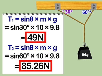 در این بخش در نظر داریم تا نیروی کشش نخ را در سیستمی «Y» شکل بررسی کنیم. مطابق با شکل زیر، وزنهای ۱۰ کیلوگرمی توسط طنابهایی به شکل «Y» در حال تعادل است. نیروی کشش در طناب پایین مشخص و برابر با نیروی وزن حاصل از جرم ۱۰ کیلوگرمی است. از آنجایی که سیستم در حال تعادل است، باید مجموع مولفههای عمودی طنابهای و با نیروی وزن (کشش طناب پایین) برابر باشد. همچنین مولفههای افقی دو طناب و باید برابر باشند تا تعادل سیستم حفظ شود. با توجه به توضیحات فوق، برای محاسبه نیروی کشش طناب در سیستم مذکور به شرح زیر عمل میکنیم: