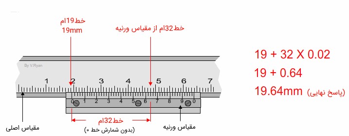 متاسفانه بر خلاف انتظارم اصلا خوب نبود خیلی راحتتر میشه کولیس رو خوند این روش شما باید ضرب انجام داد و جمع درحالی که با عدد 6 روی ورنیه می توان شصت و با شمردن خطوط ریز بعد از ان تا زمان دقیقا رو به رو بودن با خط روی خط کش 4 را خواند بدین ترتیب می شود 19.64