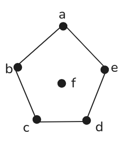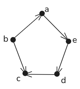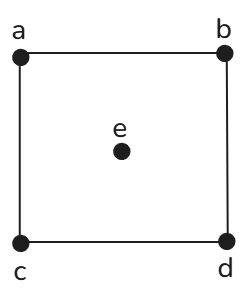 deg(a) = 2, deg(b) = 2, deg(c) = 2, deg(d) = 2, deg(e) = 0