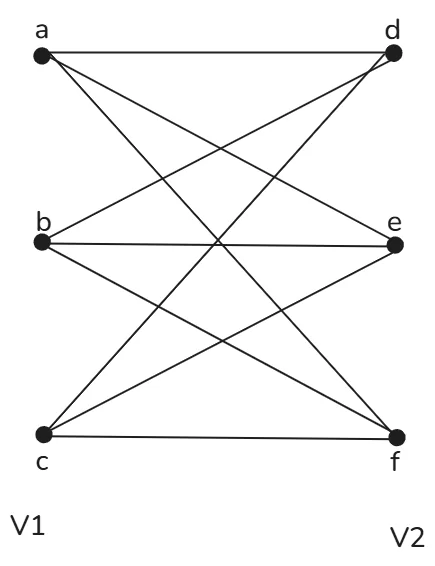 گراف شکل زیر، یک گراف دوبخشی کامل است، زیرا یال‌ها همه رئوس دو مجموعه V۱\mathrm{V_۱} و V۲\mathrm{V_۲} را به هم وصل می‌کنند.