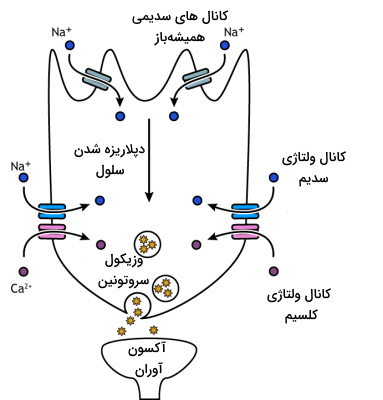 افزایش یون کلسیم، اگزوسیتوز وزیکولهای ذخیرهای انتقالدهندههای عصبی سروتونین را تحریک میکند. اتصال این مولکول به گیرندههای سطح نورونهای پسسیناپسی منجر به ایجاد پتانسیل عمل در آکسون نورونهای حسی و انتقال پیام عصبی از اعصاب جمجمهای میشود.