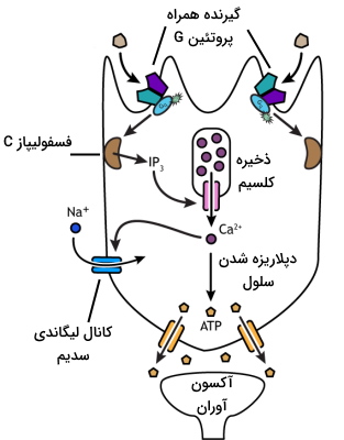 در بخشهای قبلی با هم مرور کردیم مکانیسم انتقال پیام عصبی مزه ترش و شور در گیرنده چشایی چیست. گیرندههای تلخی، شیرینی و اومامی بهوسیله گیرندههای غشایی همراه پروتئین G شناسایی میشوند. انواع این گیرندهها به مولکول های مختلف متصل میشوند اما از مکانیسم مشترکی پیام عصبی مزه را به آکسون وابران منتقل میکنند. در این مسیر با اتصال مولکولهای غذا به پروتئين عرض غشایی این سلولهای چشایی، تبادل GDP با GTP و فعال شدن پروتئین G را به همراه دارد. پروتئین G فعال آنزیم غشایی فسفولیپاز C را فعال میکند. این آنزیم لیپیدهای فسفاتیدیل اینوزیتول بیسفسفات در غشای پلاسمایی را به مولکولهای دیآسیل گلیسرول (DAG) و اینوزیتول تریفسفات (IP3) هیدرولیز میکند. IP3 با اتصال به کانالهای کلسیمی شبکه اندوپلاسمی صاف، ورود یون کلسیم از این اندامک به سیتوپلاسم را تسهیل میکند. افزایش غلظت یون کلسیم با فعال شدن کانالهای پنکسین در غشای انتهایی سلول چشایی و خروج انتقالدهنده عصبی ATP همراه است. اتصال ATP-گیرنده در نورون وابران، پیام عصبی مزه تلخ، شیرین و اومامی را به پتانسیل عمل تبدیل میکند.