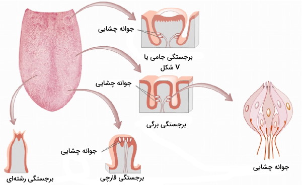 شکل برجستگیهای زبان، نوع سلولهای چشایی آن و محل قرارگیری برجستگی روی زبان متفاوت است. برجستگیهای قارچی، برگی، رشتهای و جامیشکل انواع پاپیلای زبان هستند.