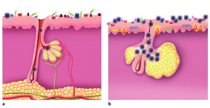 آکنه ولگاریس را نمیتوان به عنوان یک بیماری عفونی تعریف کرد، زیرا باکتری در اکثر افراد بدون ایجاد ضایعات یافت میشود. در بیشتر موارد، C. acnes در زیر کومدونها گرفتار میشود و در آنجا تکثیر یافته و میکروکومدونهایی را ایجاد میکنند که با چشم غیر مسلح قابل مشاهده نیستند و بعداً میتوانند ساختارهایی مانند کمدون بسته (سر سفید) و کمدون باز ایجاد کنند. این کومدونها میتوانند پاره شوند و مواد فولیکولی داخل درم را آزاد کنند. تصور میشد که علت این پارگی اثر غیر مستقیم متابولیسم چربی توسط باکتریها است، اما بعداً مشخص شد که باکتریها با تولید عواملی مانند پروتئازها، هیالورونیدازها و نورامینیدازها که ممکن است در نازک شدن اپیتلیوم نقش داشته باشند، در پارگی کمدوم نقش دارند.