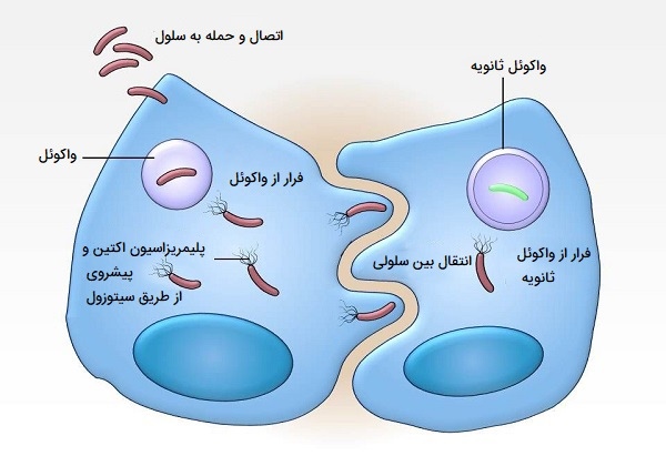 لیستریا از دستگاه سلولی برای پیشروی در داخل سلول میزبان استفاده میکند. این باکتری باعث پلیمریزاسیون مستقیم اکتین توسط پروتئین غشایی ActA میشود، بنابراین سلول باکتری را به اطراف هل میدهد. اکثر باکتریهای لیستریا قبل از اینکه بتوانند باعث عفونت شوند توسط سیستم ایمنی مورد حمله قرار میگیرند. با این حال، آنهایی که از پاسخ اولیه سیستم ایمنی بدن فرار میکنند، از طریق مکانیسمهای درون سلولی پخش میشوند که از آنها در برابر عوامل ایمنی گردش خون (AMI) محافظت میکند. پس از فاگوسیتوز، باکتری توسط اندامک فاگولیزوزوم اسیدی سلول میزبان کپسوله میشود. با این حال، لیستریا با لیز کردن کل غشای واکوئل با همولیزین ترشح شده، از فاگولیزوزوم فرار میکند، که اکنون به عنوان اگزوتوکسین لیستریولیزین O مشخص میشود. سپس باکتریها در داخل سیتوپلاسم سلول میزبان تکثیر میشوند.