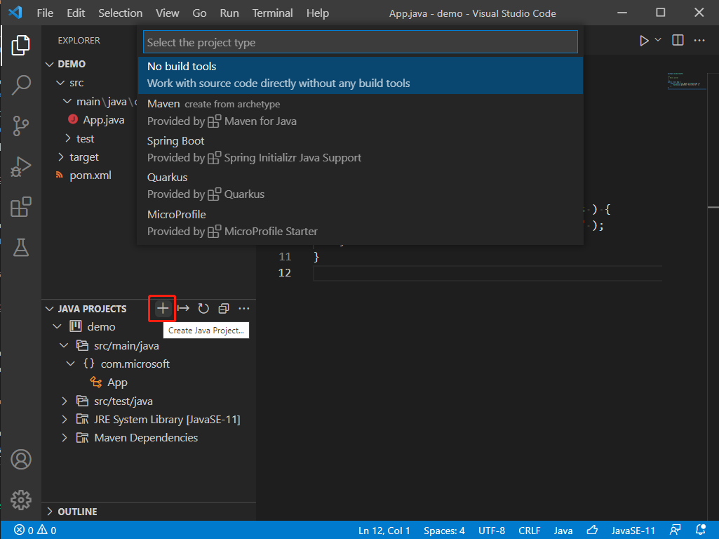 امکان ساخت یک پروژه جاوا با استفاده از دستور Java: Create Java Project نیز وجود دارد. به این منظور باید پالت فرمان را باز کرده و سپس عبارت java را وارد کنید تا این دستور نمایش یابد. پس از انتخاب دستور از شما مکان و نام پروژه پرسیده می‌شود. امکان انتخاب ابزار بیلد از این دستور نیز وجود دارد.