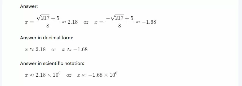 همانطور که مشاهده میکنید، ما معادله را به صورت کد نوشتهایم اما بارد آن را درک کرد و فرم ریاضی آن را نوشت. سپس، راه حل به دست آوردن جوابهای معادله را نمایش داد. در ادامه، معادله را بر اساس فرمول حل کرد و هر یک از جوابهای معادله را به صورت جداگانه به نمایش درآورد.