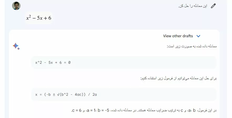 یکی از قابلیتهای جذاب بارد، امکان آپلود عکس مسائل ریاضی (چه مسائل متنی و چه مسائل فرمولی) و دریافت جواب سوالات است. در تصویر زیر، عکس یک معادله درجه دو را، توسط آیکون عکس در کنار کادر تایپ متن، برای بارد ارسال کردیم و به زبان فارسی از آن خواستیم تا معادله را برایمان حل کند.