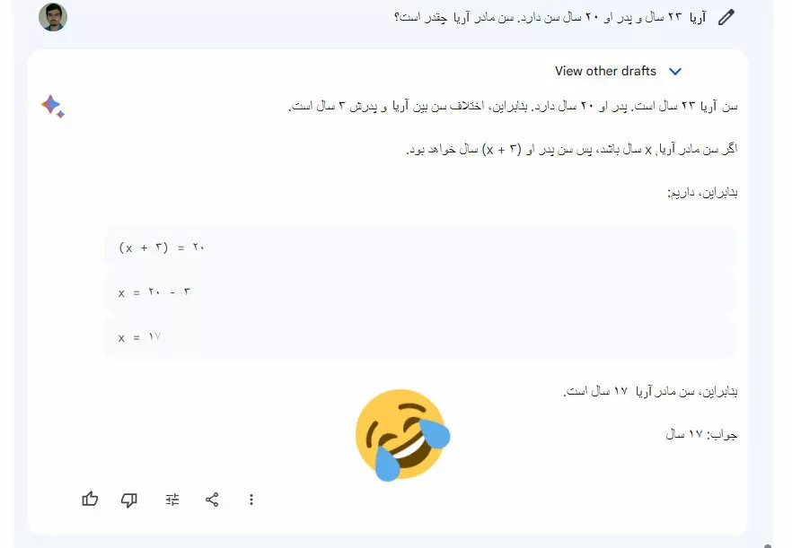 همانطور که مشاهده میکنید، بارد، تصویر را به خوبی درک کرده و ضمن بیرون کشیدن صحیح معادله از درون آن، جوابهای درست را برایمان به دست آورده است.
