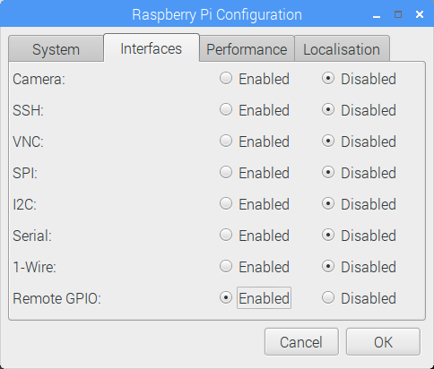 - تنظیمات رزبری پای یا Raspberry Pi Configuration را از منوی اصلی رزبری پای و گزینه Preferences باز کرده و گزینه Remote GPIO موجود در زبانه Interfaces را روی Enabled تنظیم میکنیم. این کار به ما اجازه میدهد تا بتوانیم بهصورت ریموت یا از راه دور به این رزبری پای دسترسی داشته باشیم.