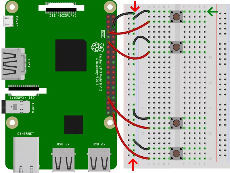 با توجه به ساختار و اتصالات داخلی بردبورد، سوراخهایی که در راستای فلش قرمزرنگ وجود دارند از داخل به هم وصل هستند. با توجه به همین خصوصیت، برای اینکه تعداد سیمکشیها کمتر شود از GND مشترک، بین دکمه و برد رزبری پای اضافی استفاده کردهایم. باقی اتصالات به پینهای GPIO نیز طبق تصویر کاملاً واضح هستند.