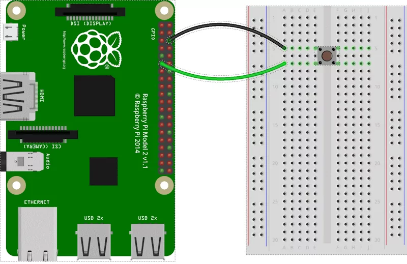 برای این کار لازم است تا اتصال سیمی بین دکمههای فشاری را با برد رزبری پای اضافی، برقرار کنیم. این دکمهها را روی بردبورد قرار میدهیم و از سیمهای جامپر برای برقراری ارتباط استفاده میکنیم.