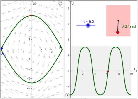 در سیستم دینامیک تکثیر باکتری، فضای حالت توسط یک منحنی تک بعدی نمایش داده شد. در سیستم دینامیک آونگ نامیرا می‌توان فضای حالت دو بعدی را به صورت یک صفحه (مانند تصویر زیر) رسم کرد. این صفحه معمولا با عنوان «صفحه فاز» (Phase Plane) شناخته می‌شود. در صفحه فاز زیر، θ(t) بر روی محور افقی و ω(t) بر روی محور عمودی رسم شده است. به این ترتیب، حالت فعلی سیستم، نقطه‌ای با مخصات (θ(t),ω(t)) بر روی صفحه فاز خواهد بود. نقطه آبی، حالت اولیه در مختصات (θ00)=(θ(0),ω(0)) را نمایش می‌دهد. فلش‌های خاکستری نیز به درک بهتر نحوه تغییر مکان جسم در فضای حالت کمک می‌کنند. جهت این فلش‌ها، معرف جهت حرکت و طول آن‌ها، معرف سرعت حرکت است.