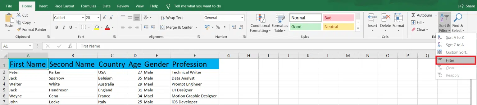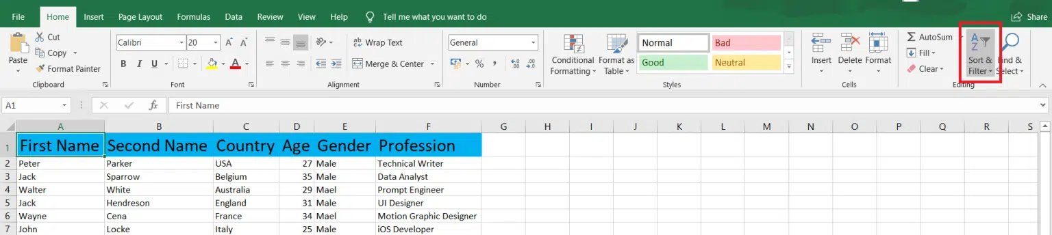 استفاده از فیلتر یکی از سادهترین راهها برای مغایرت گیری در اکسل است. برای مثال در تصویر زیر با استفاده از فیلتر دادههای اشتباه را در ستون «جنسیت» (Gender) ایزوله میکنیم. ابتدا در سربرگ «Home» روی دکمه «Sort & Filter» بزنید.