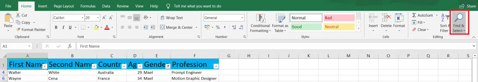 وجود مغایرت در سطرها و ستونهای اکسل میتواند حاصل خطای انسانی باشد. مثل دادههای تکراری یا بیقاعدگی در قالببندی داده. برای مثال در جدول زیر جنسیت Walter White و Wayne Cena به جای «Male»، به اشتباه «Mael» نوشته شده است. مطمئناً این ایراد حین مرور داده، یکبهیک قابل اصلاح هستند، اما وقتی با حجم زیادی از داده در سطحها و ستونها مواجهیم، این کار منطقی به نظر نمیرسد. برای اصلاح این مغایرتها در اکسل میتوانید از قابلیتهای زیر استفاده کنید: