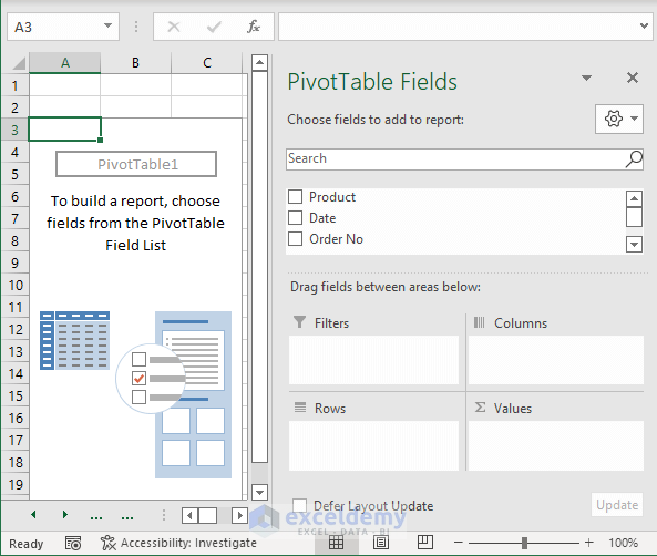پس از آن شماره سفارش (Order No) را به دو بخش «Raws» و «Values» منتقل کنید. اکسل به طور پیش فرض شماره سفارش‌ها را با هم جمع خواهد زد. نیاز است که این حالت پیش فرض را تغییر دهید.