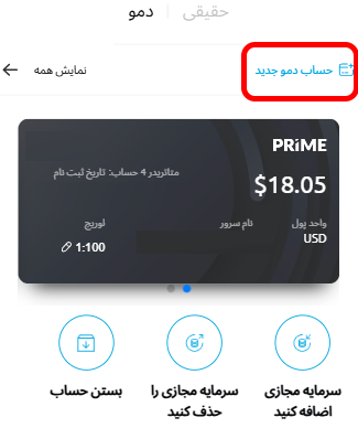 در ادامه با انتخاب گزینه دمو و کلیک بر روی حساب دموی جدید میتوانید همانطور که در تصویر مشاهده میکنید حساب دموی خود را در کارگزاری مربوطه باز کنید. گزینههایی نیز برای اضافه یا حذف کردن سرمایه مجازی در حساب دمو وجود دارد که با آن میتوانید موجودی مجازی در حساب دمو را مدیریت کنید.