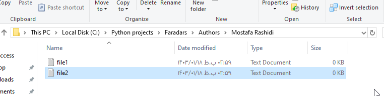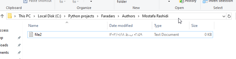 Directory 'Faradars.Blog' createdدر صورتی که برای کار با فایلها یا پوشهها در پایتون نیاز به مطالعه مطلب خلاصهتری داشته باشید میتوانید از مطلب مدیریت فایل و پوشه در پایتون به زبان ساده در مجله فرادرس بهرهمند شوید. این مطلب به صورت خلاصه، بیشتر کارهایی که میتوان با فایلها و پوشهها در پایتون انجام داد را توضیح داده است.