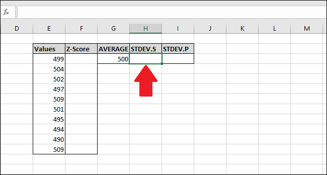 سلول نخست را در ستون Z-Score انتخاب کنید. ما در این مثال از تابع STDEV.S استفاده میکنیم؛ اما شما میتوانید از نتایج STDEV.P نیز استفاده کنید: