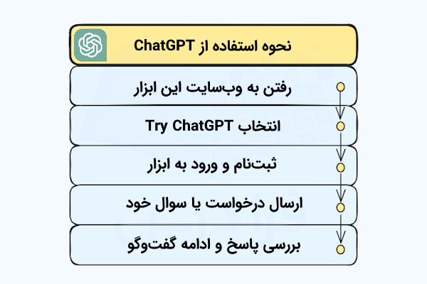 در ادامه این مطلب از مجله فرادرس نحوه استفاده از ChatGPT را از طریق وبسایت رسمی شرح دادهایم. این مراحل را در فهرست و تصویر زیر مشاهده میکنید: