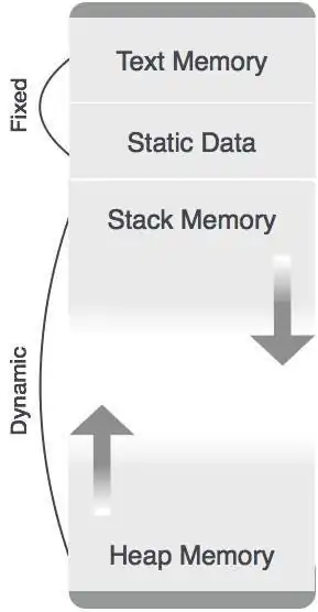 همان طور که در تصویر فوق مشخص است. بخش متنی کد دارای مقدار ثابتی از حافظه است. حافظههای پشته و هیپ در بخش انتهایی حافظه کلیِ تخصیص یافته به برنامه قرار دارند. هر دو آنها میتوانند در برابر هم افزایش یا کاهش داشته باشند.