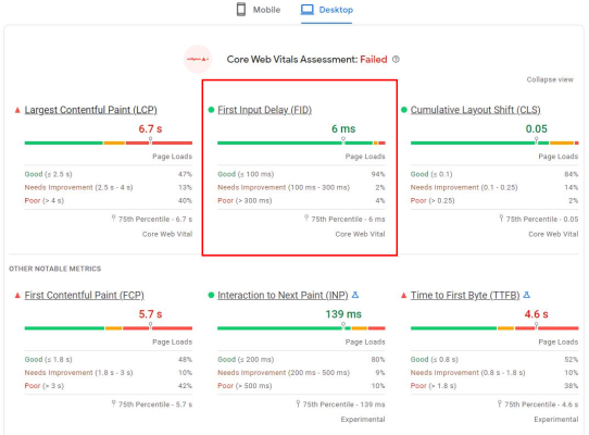 بررسی وضعیت معیار FID در سرچ کنسول گوگل نیز با دشواریهایی همراه است و در بسیاری از موارد اصلا گزارشی برای این معیار ثبت نمیشود یا بهصورت «ضعیف» و با رنگ قرمز ثبت میشود. مانند آنچه در تصویر زیر میبینید: