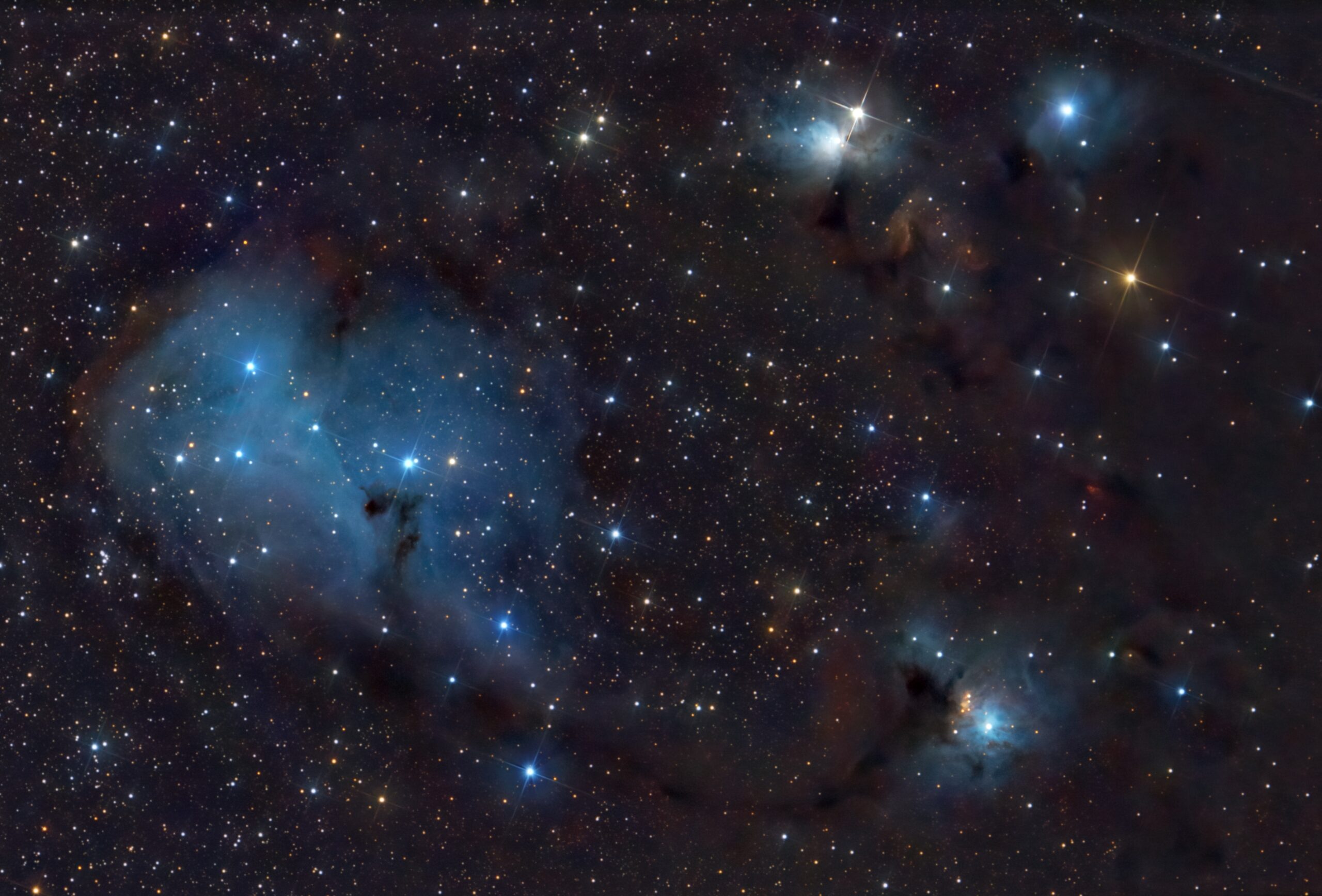 بهنظر میرسد سحابیهای بازتابی آبیرنگ، این پهنه غبارآلود را پر کردهاند. این چارچوب تلسکوپی واضح، بیش از یک درجه از آسمان را در صورت فلکی کمنور «تکشاخ» (Monoceros) پوشش میدهد. سحابی آبی IC 447 که در مجموعه ابر «تکشاخ آر۱» (Monoceros R1) با فاصله تقریباً ۲,۵۰۰ سال نوری از زمین دیده میشود، در سمت چپ قرار دارد و توسط یک رشته تاریک و طویل از گردوغبار به سحابی IC 446 در سمت راست و پایینتر متصل شده است.