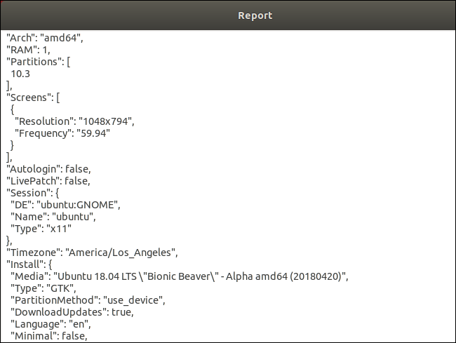 اگر میخواهید بدانید چه دادههایی به سرورهای اوبونتو ارسال میشوند، میتوانید بر روی «Show the First Report» کلیک کنید. دادههایی مانند سختافزار رایانه، شامل سازنده، نسخه بایوس، مدل سیپییو و ... در این گزارش آمدهاند. این گزارش همچنین شامل اطلاعاتی در مورد نرمافزار مانند نسخه اوبونتویی که نصب شده است، محیط دسکتاپی که انتخاب کردهاید، استفاده یا عدم استفاده از سرور نمایش Xorg یا Wayland و گزینههایی که در حین نصب اوبونتو انتخاب کردهاید، میشود. اطلاعات دیگر مانند منطقه زمانی، اطلاعاتی در مورد پارتیشنها و وضوح صفحه نمایش شما نیز ارسال میشوند.