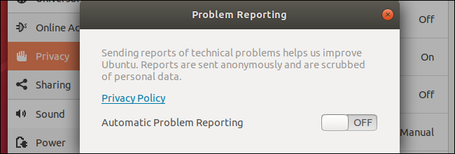 اوبونتو 18.04 دادههایی در مورد سختافزار و نرمافزار رایانه، بستههایی که نصب کردهاید و برنامههایی که از کار میافتند گردآوری میکند و همه آنها را به سرورهای اوبونتو ارسال میکند. شما میتوانید جلوی این کار را در سه مکان مختلف بگیرید.